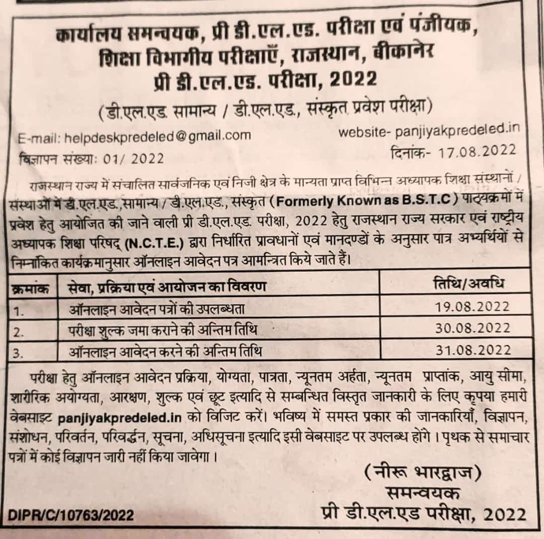 परीक्षा फीस:- D.El.Ed. (सामान्य) अथवा D.El.Ed. (संस्कृत) किसी एक पाठयक्रम के लिये 450 रूपये तथा दोनो के लिये 500 रूपये। ईमित्र द्वारा ऑनलाईन फार्म भरने की लास्ट डेट 30 अगस्त 2022 है।