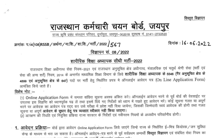 राजस्थान कर्मचारी चयन बोर्ड ने जारी की भर्ती विज्ञप्ति,5546 पदों पर भर्ती विज्ञप्ति जारी, 23 जून 2022 से 22 जुलाई 2022 तक होंगे ऑनलाइन आवेदन, 25 सितंबर को आयोजित होगी शारीरिक शिक्षा अध्यापक सीधी भर्ती परीक्षा!