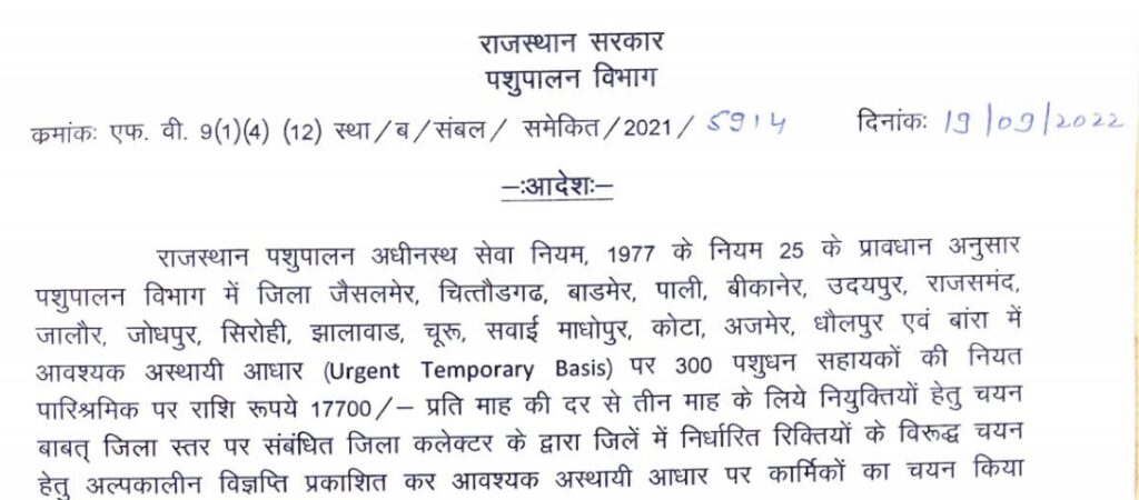 Offline राजस्थान पशुपालन विभाग में बिना परीक्षा के पाएं नौकरी, 20 सितंबर 2022 को जारी नोटिफिकेशन