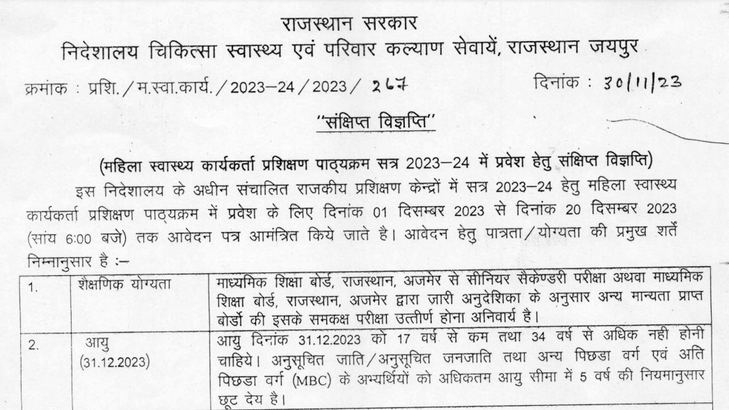 इस निदेशालय के अधीन संचालित राजकीय प्रशिक्षण केन्द्रों में सत्र 2023-24 हेतु महिला स्वास्थ्य कार्यकर्ता प्रशिक्षण पाठ्यक्रम में प्रवेश के लिए दिनांक 01 दिसम्बर 2023 से दिनांक 20 दिसम्बर 2023 (सांय 6:00 बजे) तक आवेदन पत्र आमंत्रित किये जाते है। आवेदन हेतु पात्रता / योग्यता की प्रमुख शर्तें निम्नानुसार है :-