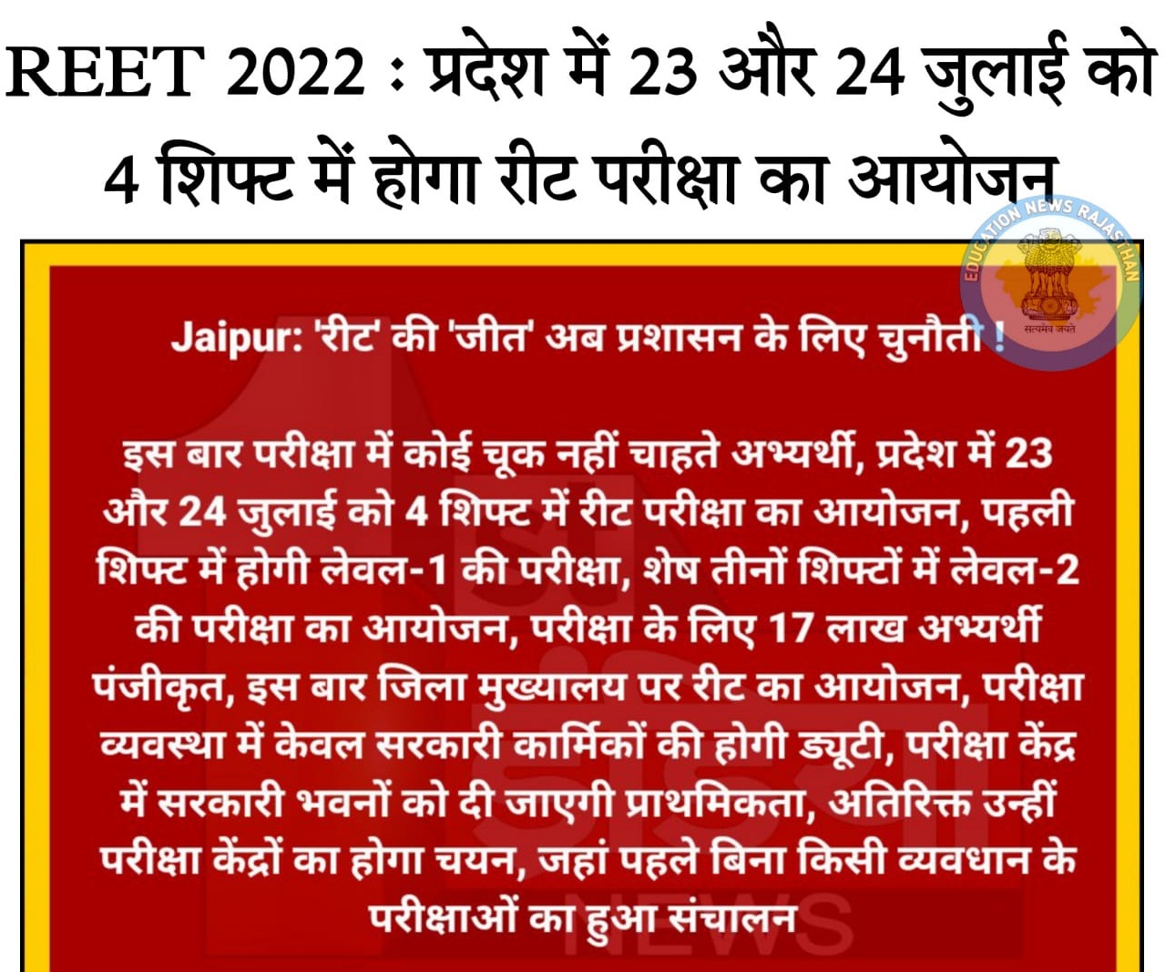 राजस्थान में 23 और 24 जुलाई को चार शिफ्ट में रीट परीक्षा का आयोजन किया जाएगा। 23 जुलाई को पहली शिफ्ट में लेवल-1 की परीक्षा और शेष तीनों शिफ्टों में लेवल-2 की परीक्षा आयोजित की जाएगी।