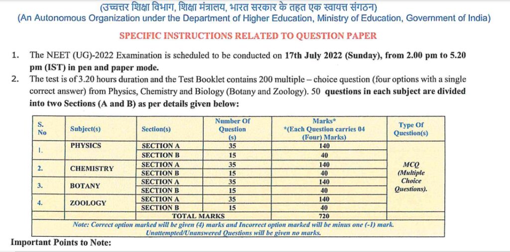 COVID-19 के लिए एहतियात के तौर पर, उम्मीदवार को एडमिट कार्ड में रिपोर्टिंग / केंद्र में प्रवेश के समय के अनुसार केंद्र पर पहुंचना होगा।NEET 2022 answer Key